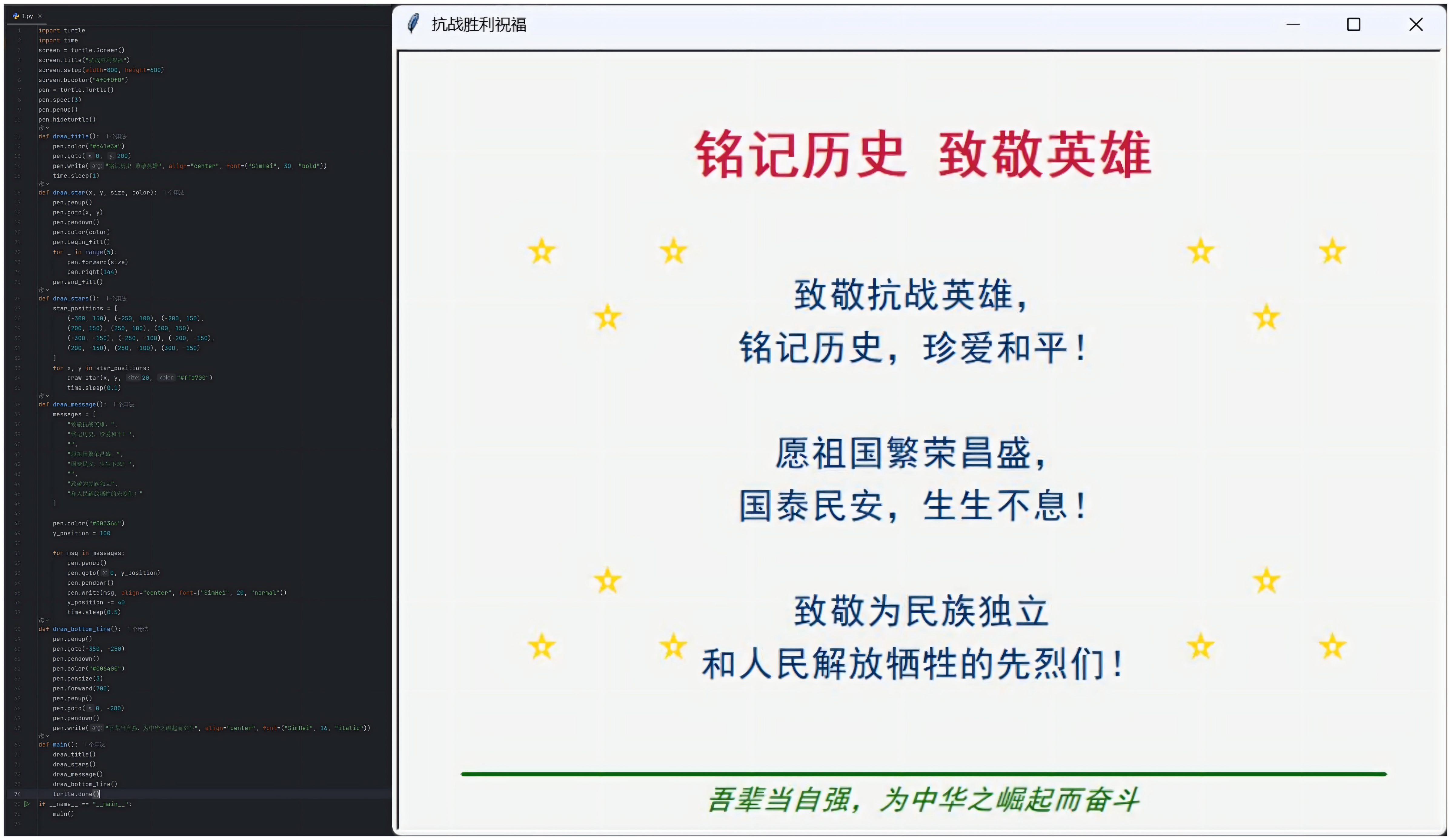 学院学生会发起“三行代码颂祖国”实践活动,将专业教学与红色教育深度融合。师生以python、c 等编程语言为核心载体,创新采用时间轴标注(串联抗战关键节点)、动态文字生成(呈现爱国语句)、红色地标像素绘制(还原抗战纪念场景)等形式,把抗战历程的厚重历史与爱国情怀的精神内核融入代码创作,共征集并筛选出逻辑清晰、创意鲜明的优秀作品50余件,让红色故事通过数字载体更生动地传播。谈及此次活动设计的初衷,学院社团指导教师卞文馨说,“策划‘三行代码颂祖国’活动,旨在引导学生将铭记历史与时代担当紧密结合。我们希望通过这种专业实践,让学生深刻理解,专业学习绝不仅仅是掌握技术技能,更是一种表达情感、传承精神的重要工具,是赋能爱国主义教育的新途径。”